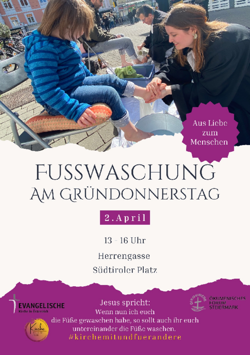 Im Sinne des Bibelwortes "Jesus spricht: Wenn nun ich euch die Füße gewaschen habe, so sollt auch ihr euch untereinander die Füße waschen" findet am Gründonnerstag, 2.4.2026 von 13.00 Uhr bis 16.00 Uhr eine Fußwaschung in der Herrengasse und am Südtiroler Platz in Graz statt. Diese schöne Aufgabe übernehmen Pfarrer:innen aus den verschiedenen Kirchen des Ökumenischen Forums in Graz.