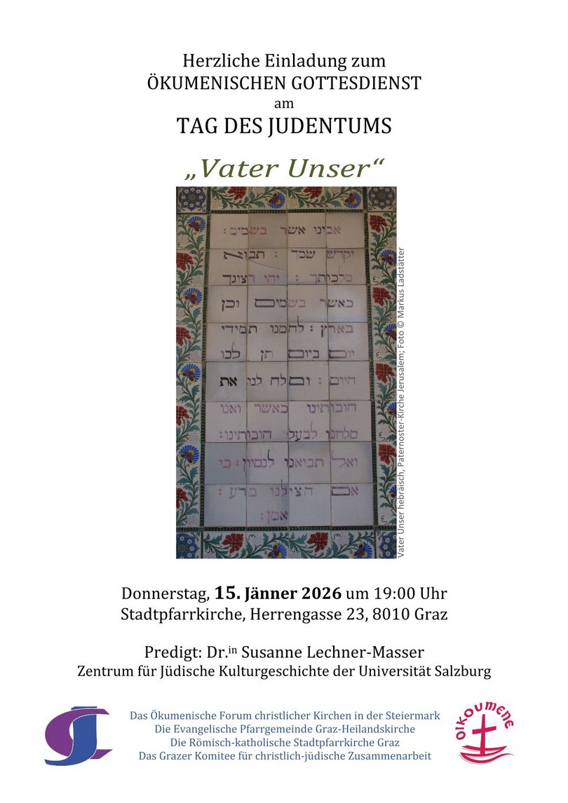Herzliche Einladung zum ökumenischen Gottesdienst zum "Tag des Judentums" am 15.1.2026, um 19.00 Uhr in der römisch-katholischen Stadtpfarrkirche, Graz, Herrengasse 23!